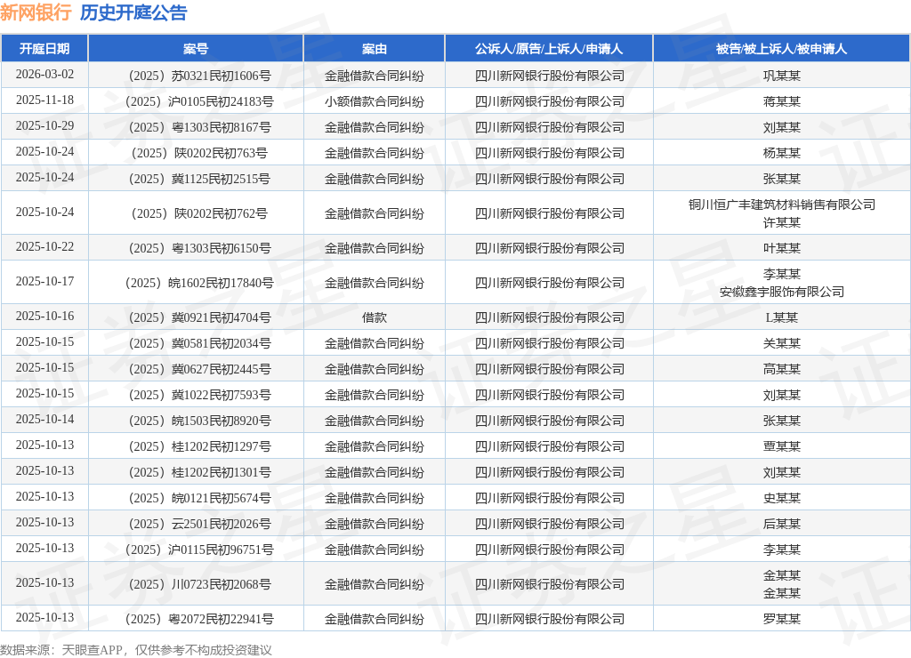 本站消息,根据天眼查APP显示,近日公布了一则四川新网银行股份有限公司作为原告/上诉人的开庭公告,详细内容如下: